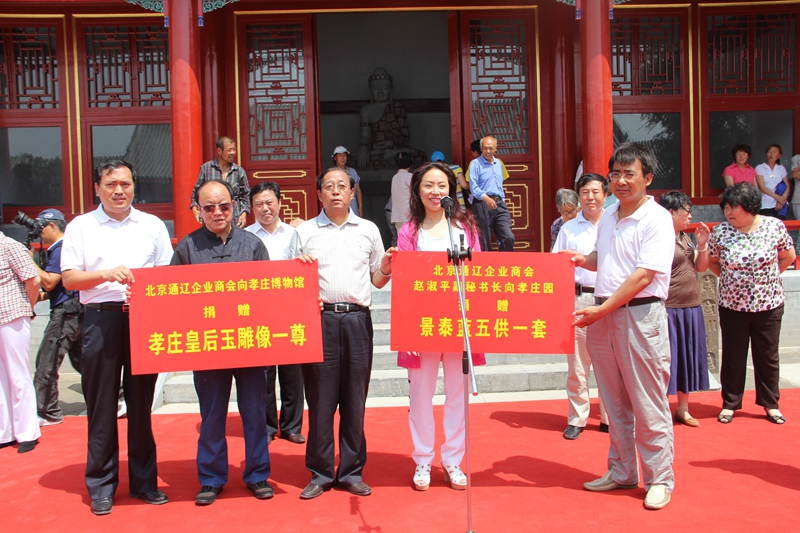北京通遼企業(yè)商會(huì)副會(huì)長(zhǎng)、北京富貴天使珠寶公司董事長(zhǎng)魏相春及宋艷華女士向孝莊園捐贈(zèng)了由60噸緬甸玉原石雕刻的玉佛像一尊,佛像袈裟鑲嵌48880顆寶石;副秘書(shū)長(zhǎng)趙淑平捐贈(zèng)了景泰藍(lán)佛前五供等用品。魏相春會(huì)長(zhǎng)在捐贈(zèng)儀式上說(shuō):”關(guān)注民族文化、尊重民族歷史是我們每個(gè)中國(guó)人的職責(zé)”。充分體現(xiàn)了在京游子對(duì)家鄉(xiāng)的不了情。原政協(xié)主協(xié)王明義、會(huì)長(zhǎng)包國(guó)安及副會(huì)長(zhǎng)魏相春、宋艷華女士為玉佛揭幕,并合影留念。